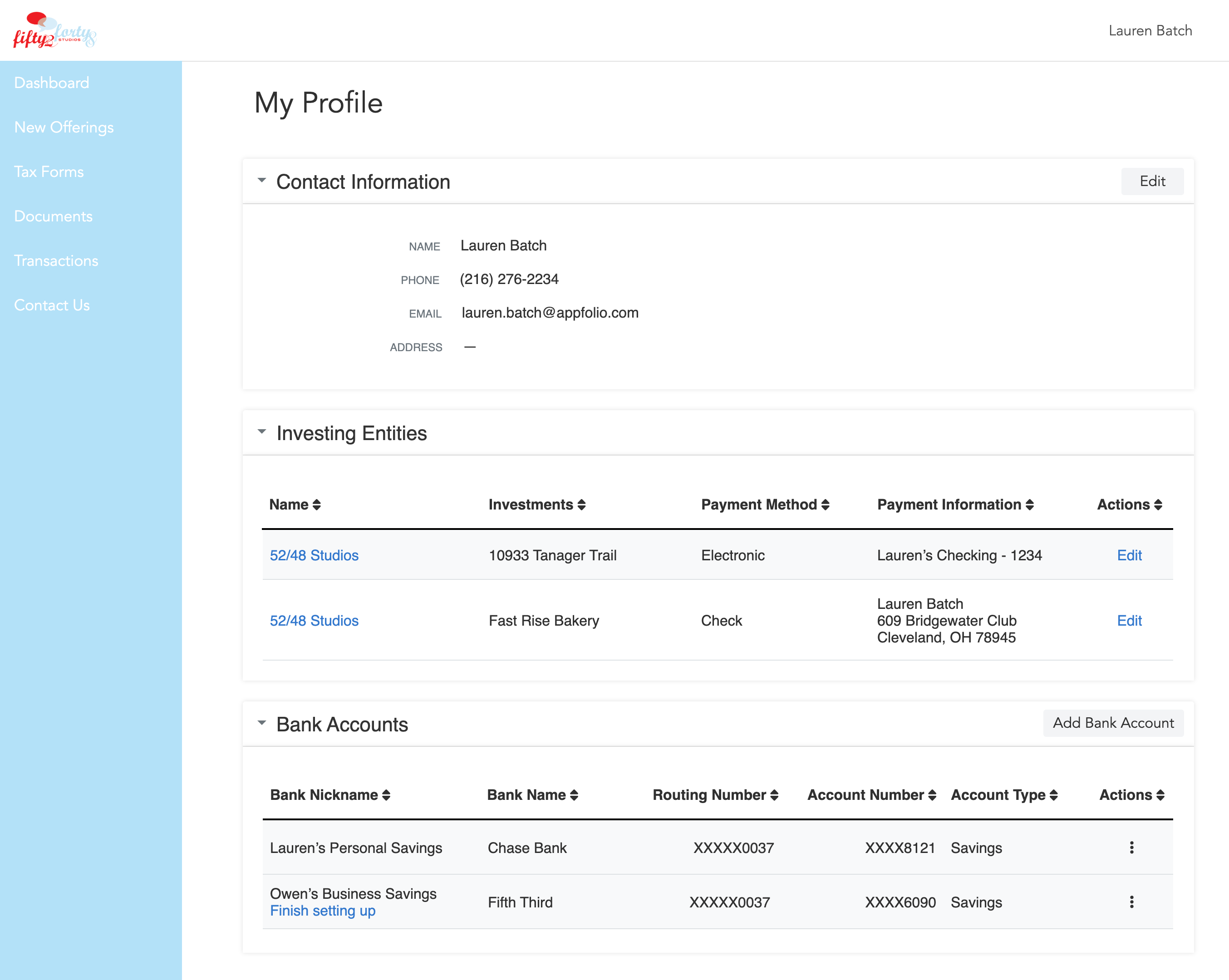 Pulled Bank Accounts out of an existing component and added a "Bank Account" block to the Investor Profile Page.